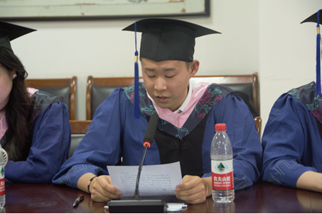 毕业生代表刘利炜在发言中代表同学们对老师和公司的培养表达了由衷的感谢,他以春夏秋冬来总结自己的研究生生涯。即将踏上新征程,他呼吁大家继续秉承“厚德博学,崇实去浮”的校训,牢记“厚德崇实、资政育人”的院训,不忘初心,砥砺前行。
