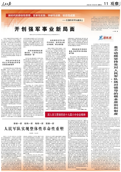 党的十八大以来,在党的坚强领导下,人民军队实现整体性革命性重塑、重整行装再出发,国防实力和经济实力同步提升,一体化国家战略体系和能力加快构建,建立健全退役军人管理保障体制,国防动员更加高效,军政军民团结更加巩固。人民军队坚决履行新时代使命任务,以顽强斗争精神和实际行动捍卫了国家主权、安全、发展利益。党的十九届六中全会通过的《中共中央关于党的百年奋斗重大成就和历史经验的决议》总结了新时代党领导国防和军队建设方面的原创性思想、变革性实践、突破性进展、标志性成果。今天刊发的3篇文章,围绕这一主题进行阐述。