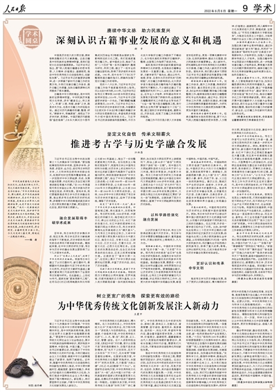 增强融合意识。中国的学术传统本是“经史子集”一体,“文史哲”不分家。现代考古学的前身“金石学”也是为经史研究服务的,加强考古学与历史学的融合发展有着优良的民族学术传统基础。推进融合发展,需要进一步克服以往学科设置过细、学科界限划分过于严格带来的影响。要增强融合意识,让历史研究工作者更积极利用考古前沿信息,让考古工作者更好掌握古代文献典籍,并运用到文物研究工作中,在更大的学术格局中实现融合发展,彰显中国特色、中国风格、中国气派。