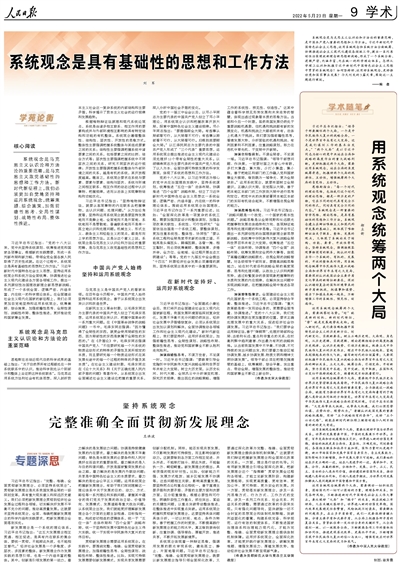 系统观念是马克思主义认识论和方法论的重要范畴,是中国共产党人重要的思想和工作方法。习近平新时代中国特色社会主义思想,运用系统观念和系统方法全面统筹、协调推进社会主义现代化建设各领域工作,提出一系列原创性治国理政新理念新思想新战略,形成了一个系统全面、逻辑严密、内涵丰富、内在统一的科学理论体系。怎样从学理上认识和把握习近平新时代中国特色社会主义思想中贯穿的系统观念?如何坚持好、运用好系统观念,更好推动党和国家事业发展?今天刊发的3篇文章,围绕这一主题进行阐述。