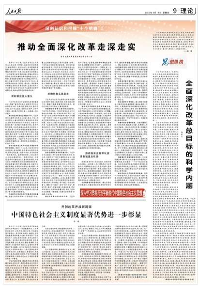 习近平新时代中国特色社会主义思想,明确全面深化改革总目标是完善和发展中国特色社会主义制度、推进国家治理体系和治理能力现代化。深入学习贯彻习近平新时代中国特色社会主义思想,必须深刻认识把握全面深化改革总目标的科学内涵和实践要求,坚持正确改革方向,不断推动全面深化改革向广度和深度进军,为党和国家事业发展提供根本制度保障、注入强大生机活力。《推动全面深化改革走深走实》《全面深化改革总目标的科学内涵》《开创改革开放新局面 中国特色社会主义制度显著优势进一步彰显》(点击标题查看全文)围绕这一主题进行阐述。