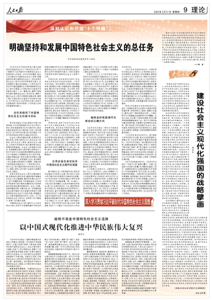 党的十九届六中全会通过的《中共中央关于党的百年奋斗重大成就和历史经验的决议》指出,习近平新时代中国特色社会主义思想“明确坚持和发展中国特色社会主义,总任务是实现社会主义现代化和中华民族伟大复兴,在全面建成小康社会的基础上,分两步走在本世纪中叶建成富强民主文明和谐美丽的社会主义现代化强国,以中国式现代化推进中华民族伟大复兴”。深入学习贯彻习近平新时代中国特色社会主义思想,必须深刻认识把握坚持和发展中国特色社会主义总任务的科学内涵和实践要求,奋进全面建设社会主义现代化国家新征程,在中国特色社会主义道路上向着中华民族伟大复兴的宏伟目标砥砺前行。《明确坚持和发展中国特色社会主义的总任务》《建设社会主义现代化强国的战略擘画》《始终不渝走中国特色社会主义道路 以中国式现代化推进中华民族伟大复兴》(点击标题查看全文)围绕这一主题进行阐述。