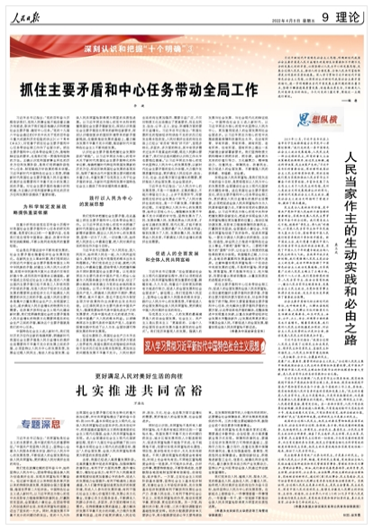 习近平新时代中国特色社会主义思想,明确新时代我国社会主要矛盾是人民日益增长的美好生活需要和不平衡不充分的发展之间的矛盾,必须坚持以人民为中心的发展思想,发展全过程人民民主,推动人的全面发展、全体人民共同富裕取得更为明显的实质性进展。深入学习贯彻习近平新时代中国特色社会主义思想,必须深刻认识新时代我国社会主要矛盾的转化,进一步明确解决当代中国发展主要问题的根本着力点,坚持不懈推进高质量发展、创造高品质生活,不断满足人民对美好生活的向往。《抓住主要矛盾和中心任务带动全局工作》《人民当家作主的生动实践和必由之路》《更好满足人民对美好生活的向往 扎实推进共同富裕》(点击标题查看全文)围绕这一主题进行阐述。