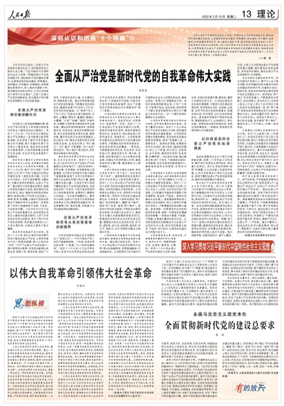 习近平新时代中国特色社会主义思想,“明确全面从严治党的战略方针,提出新时代党的建设总要求,全面推进党的政治建设、思想建设、组织建设、作风建设、纪律建设,把制度建设贯穿其中,深入推进反腐败斗争,落实管党治党政治责任,以伟大自我革命引领伟大社会革命。”深入学习贯彻习近平新时代中国特色社会主义思想,必须贯彻落实全面从严治党的战略方针和新时代党的建设总要求,确保党在新时代坚持和发展中国特色社会主义的历史进程中始终成为坚强领导核心。《全面从严治党是新时代党的自我革命伟大实践》《以伟大自我革命引领伟大社会革命》《永葆马克思主义政党本色 全面贯彻新时代党的建设总要求》(点击标题查看全文)围绕这一主题进行阐述。