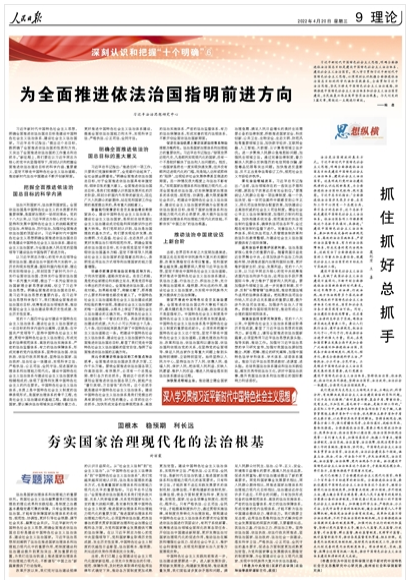 习近平新时代中国特色社会主义思想,明确全面推进依法治国总目标是建设中国特色社会主义法治体系、建设社会主义法治国家。深入学习贯彻习近平新时代中国特色社会主义思想,必须深刻认识把握全面推进依法治国总目标的科学内涵和实践要求,全面贯彻习近平法治思想,坚定不移走中国特色社会主义法治道路,协调推进中国特色社会主义法治体系和社会主义法治国家建设,为民族复兴伟业筑牢坚实法治根基。《为全面推进依法治国指明前进方向》《抓住抓好总抓手》《固根本 稳预期 利长远 夯实国家治理现代化的法治根基》(点击标题查看全文)围绕这一主题进行阐述。