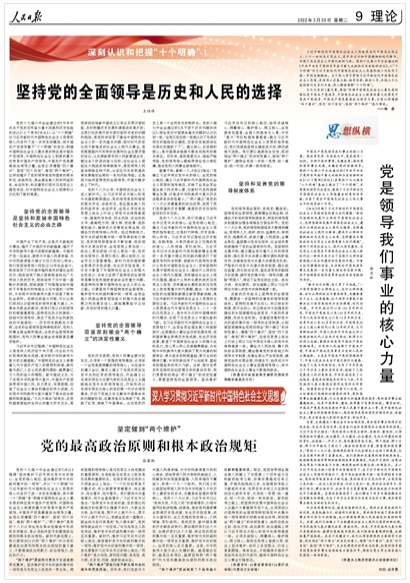 《坚持党的全面领导是历史和人民的选择》《党是领导我们事业的核心力量》《坚定做到“两个维护” 党的最高政治原则和根本政治规矩》(点击标题查看全文),围绕“明确中国特色社会主义最本质的特征是中国共产党领导,中国特色社会主义制度的最大优势是中国共产党领导,中国共产党是最高政治领导力量,全党必须增强‘四个意识’、坚定‘四个自信’、做到‘两个维护’”进行阐述。