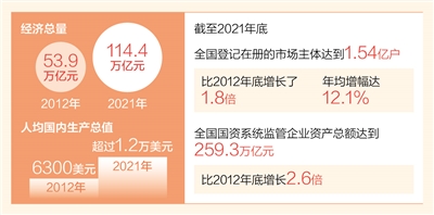 经济总量由2012年的53.9万亿元上升到2021年的114.4万亿元,人均国内生产总值从6300美元上升到超过1.2万美元……这十年,中国号巨轮不断破浪前行,经济实力跃上新台阶,充分彰显出社会主义制度的优越性。