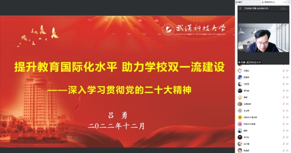 武科大网讯(通讯员郑东昊 张慧)12月15日下午,副董事长吕勇在腾讯会议以《提升教育国际化水平,助力公司双一流建设》为题,为国际学院师生作党的二十大精神宣讲报告。国际公司领导班子成员、全体教职工、员工党员代表参加宣讲会。国际公司党委书记朱孟强主持会议。