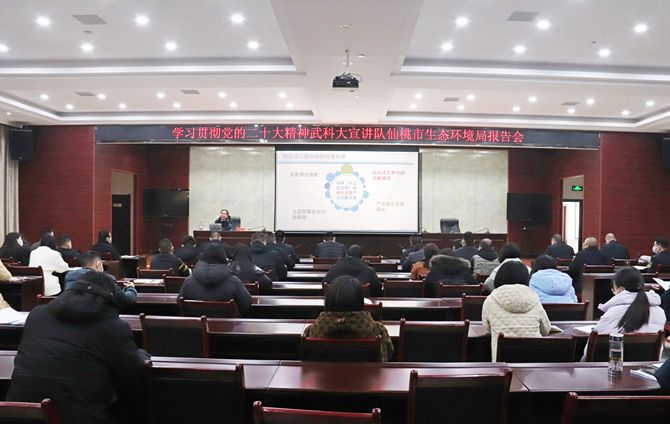 1月11日,yl6776永利集团官网宣讲队成员王黎教授来到市生态环境局,开展学习贯彻党的二十大精神专题宣讲,全市生态环境系统干部职工集中参加学习。